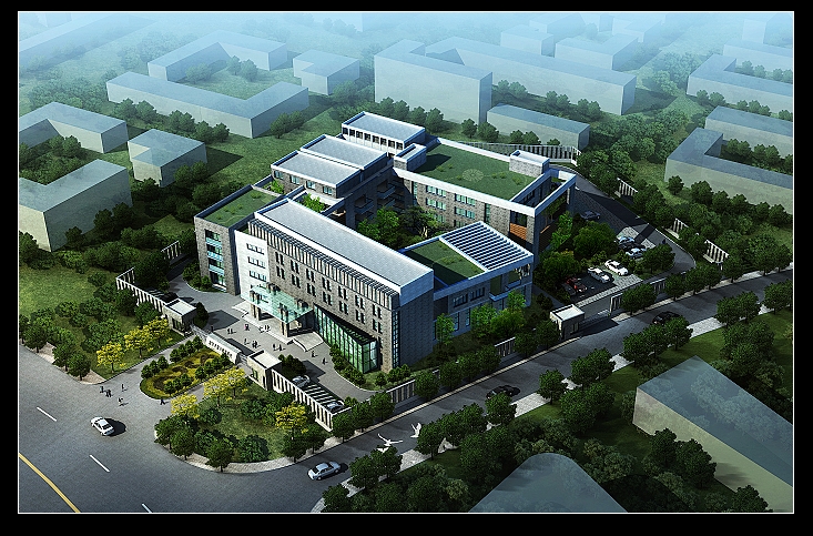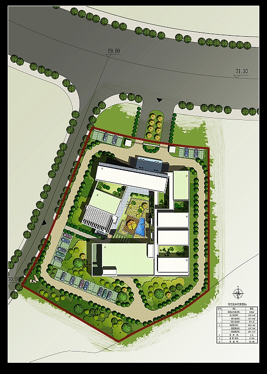 基地總用地面積為6353平方米。結合基地的地貌特征,確定梯形建筑控制線(xiàn),布置“T”型的綠地軸于此形成呼應,總體布局根據綠地軸線(xiàn)布置,形成了多形態(tài)的空間組合。