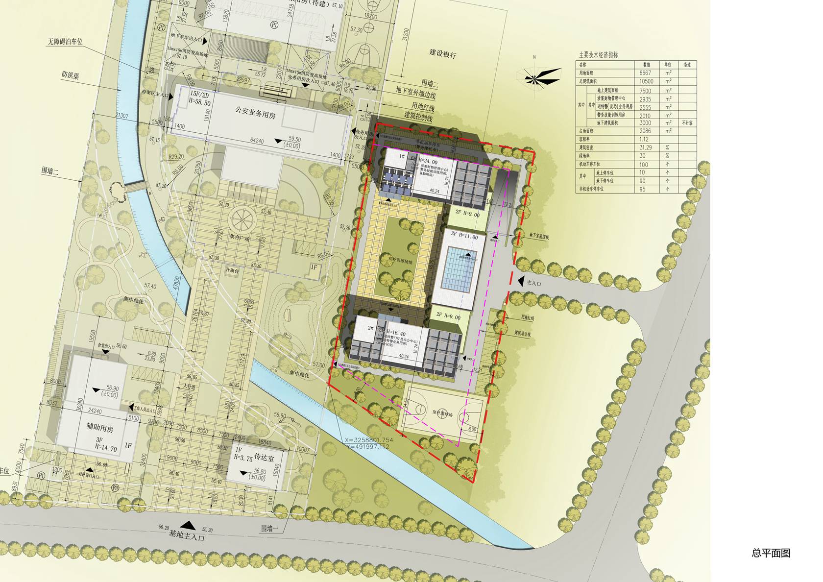 浦江縣刑事訴訟涉案財物管理中心及公安局巡特警(反恐)業(yè)務(wù)用房建設工程設計項目位于浦江縣恒昌大道南側,蔣村農居點(diǎn)以西,公安大樓以東,建設銀行以南地塊。建設規模為用地面積6667平方米,總建筑面積10500平方米,其中地上建筑面積7500平方米,地下建筑面積3000平方米,容積率為1.12,建筑密度31.29%。