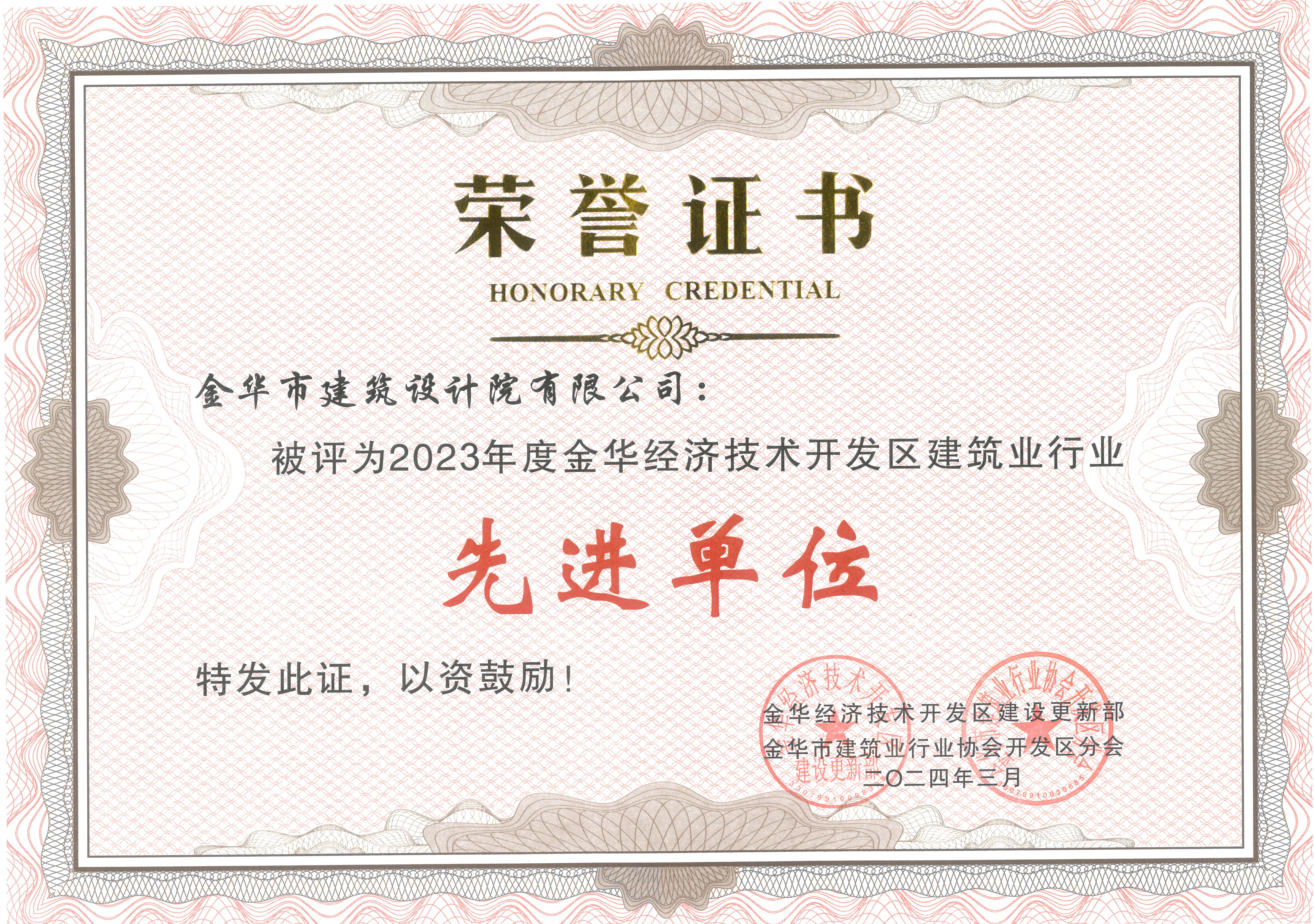 祝賀我公司被金華經(jīng)濟技術(shù)開(kāi)發(fā)區建設更新部、金華市建筑業(yè)行業(yè)協(xié)會(huì )開(kāi)發(fā)區分會(huì )評為2023年度金華經(jīng)濟技術(shù)開(kāi)發(fā)區建筑業(yè)行業(yè)先進(jìn)單位。
