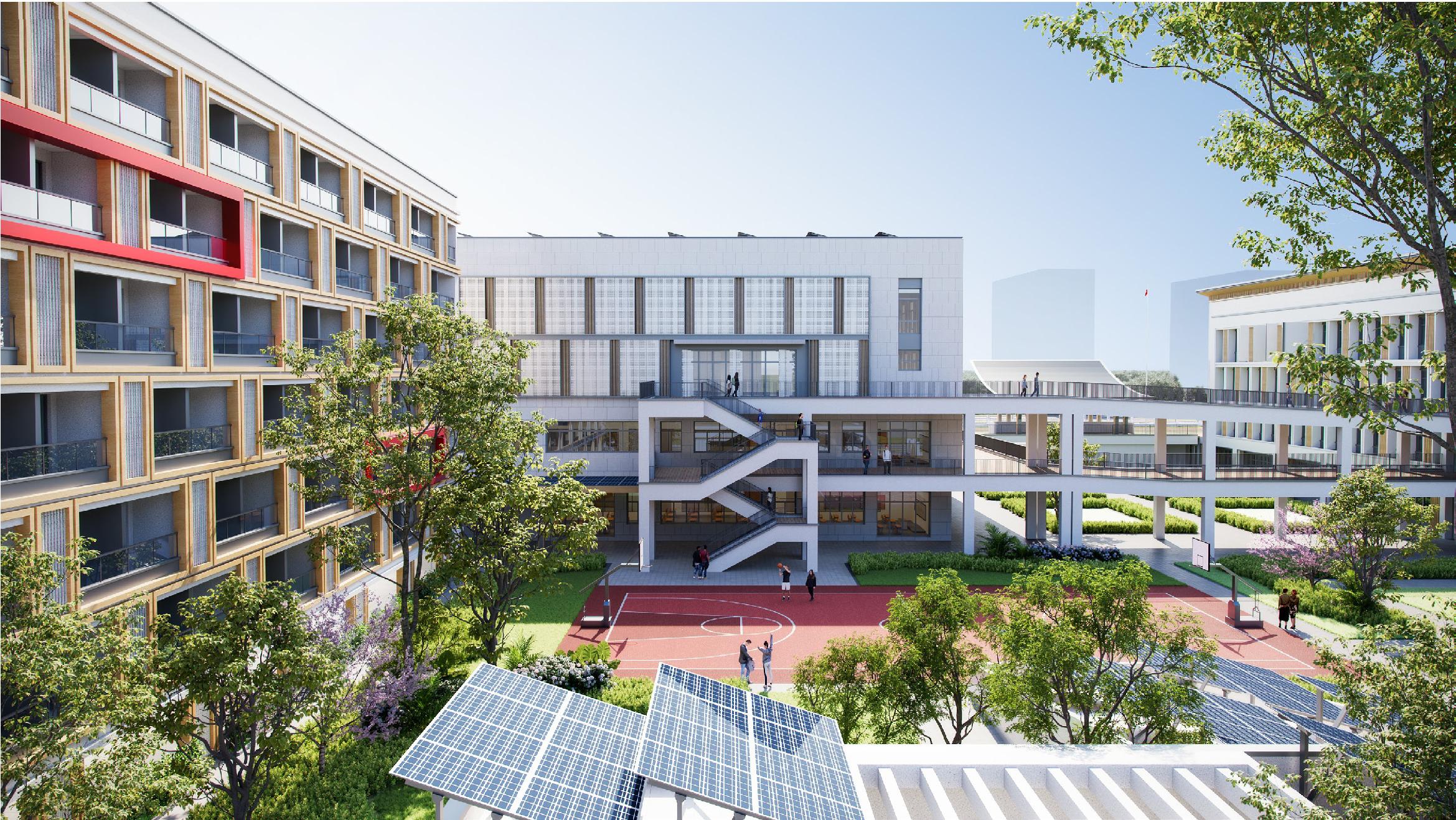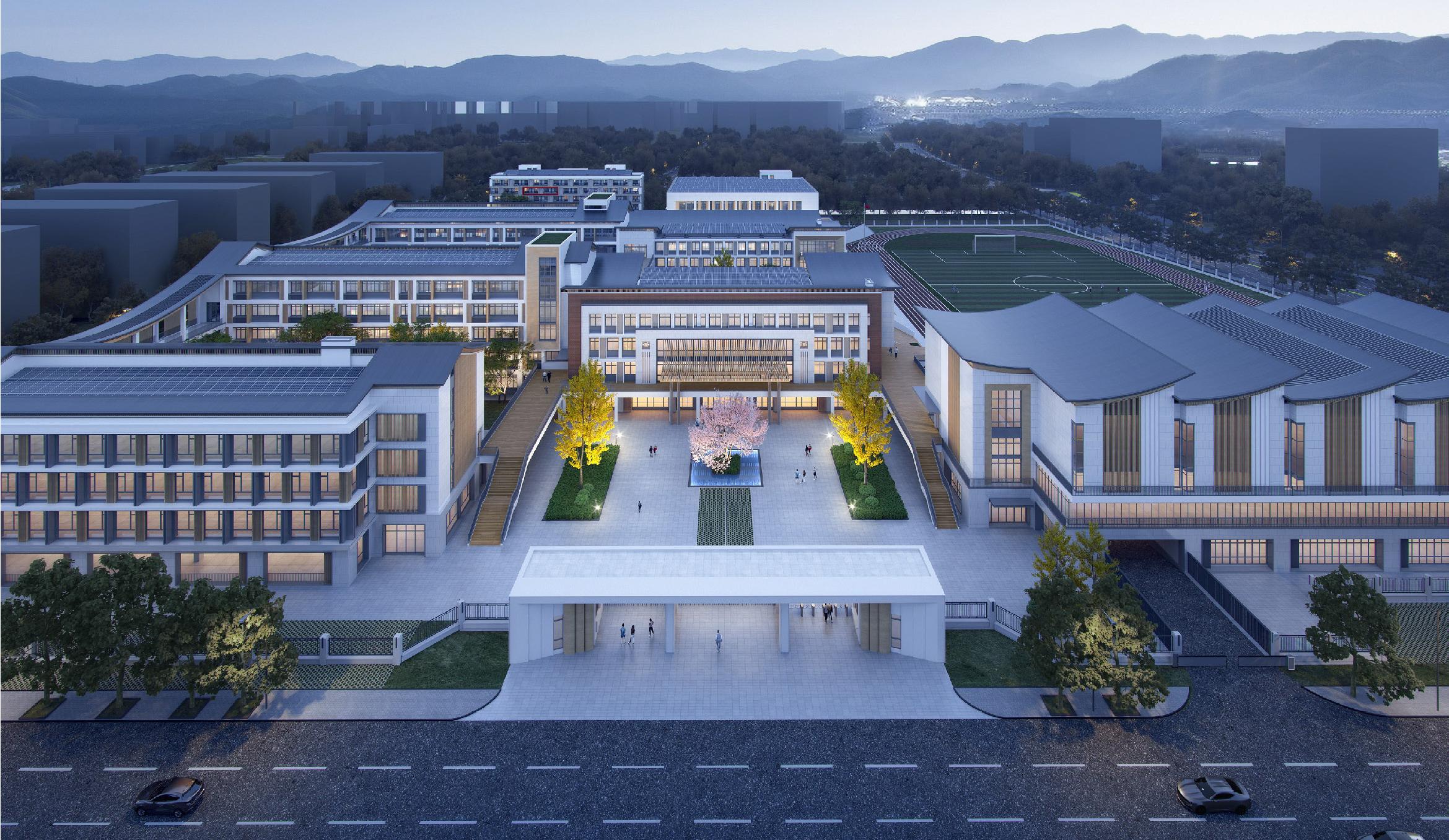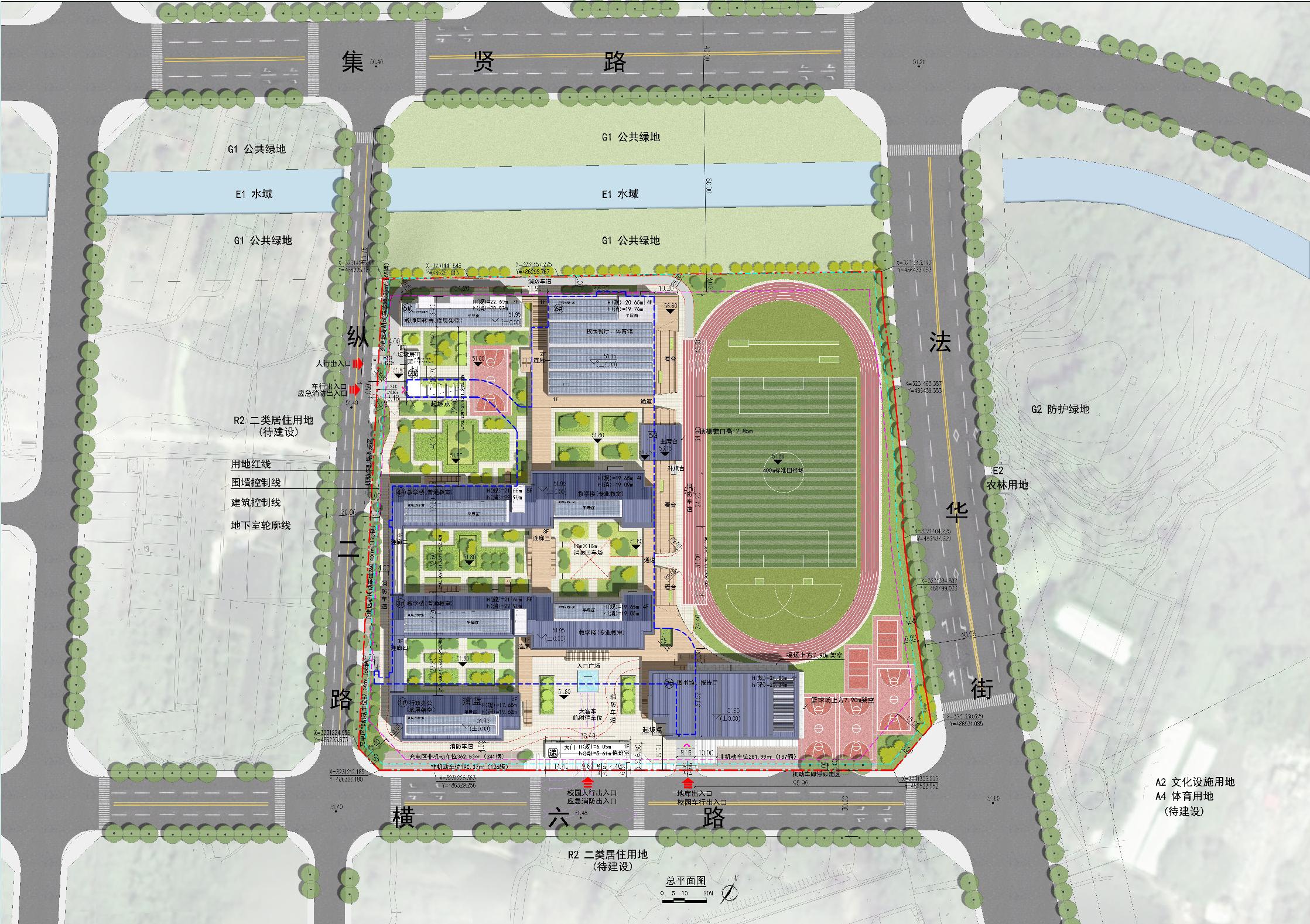 面積47456.04㎡,地下建筑面積16176.33㎡;容積率為0.85,建筑密度28.21%。辦學(xué)規模48個(gè)班,能容納學(xué)生2400 人,建設內容包括:1#樓